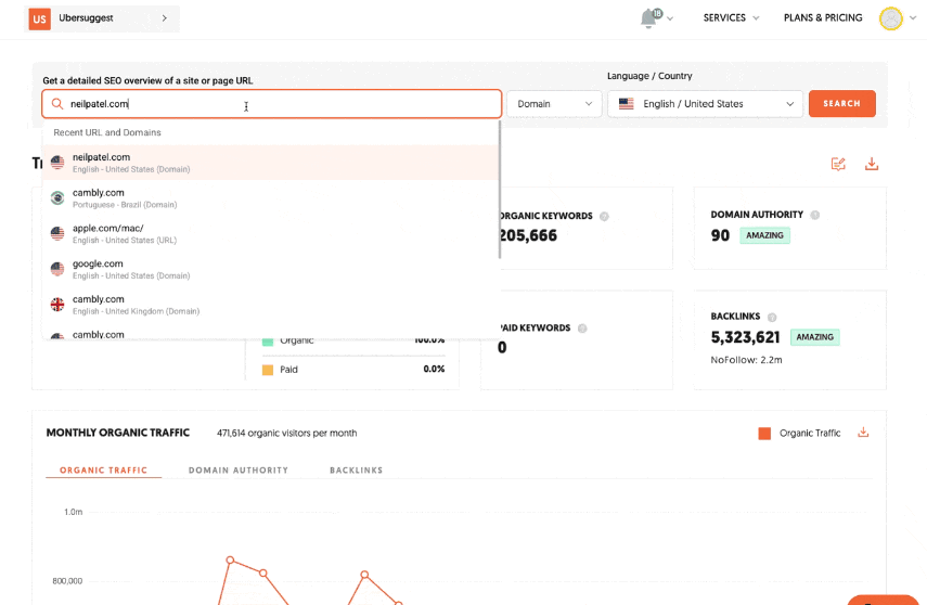 Want to get more done in less time? The new Ubersuggest Historical Search Suggestions feature automatically saves your searches across all reports, so you can jump back in with a single click.